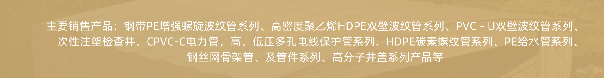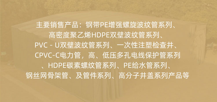 钢带PE增强螺旋波纹管系列、高密度聚乙烯HDPE双壁波纹管系列、PVC-U双壁波纹管系列、一次性注塑检查井、CPVC-C电力管,高、低压多孔电线保护管系列、HDPE碳素螺纹管系列、PE给水管系列、钢丝网骨架管、及管件系列、高分子井盖系列产品等等