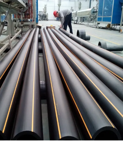 (4)PE 80级树脂的颜色为黄色或者黑色,生产的管材颜色为黄色或黑色管材加黄色标记,PE 100级树脂的颜色为橙色或黑色,生产的管材颜色为橙色或黑色管材加橙色标记。制造标记色条的混配料的基础树脂,必须与生产